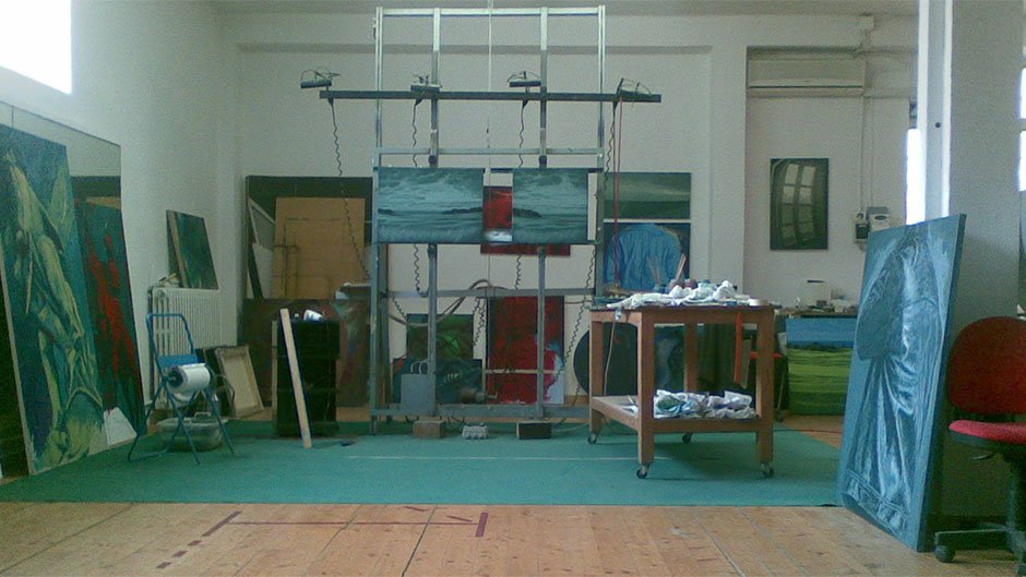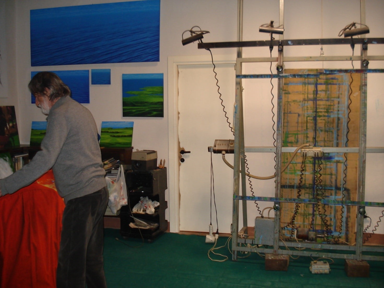 Continuavi instancabile il tuo lavoro, come se Mauri o Ferruccio o Sandro e io stesso non fossimo li' a rompere la concentrazione e procedevi con cura e metodo artigianale a mescolare i colori, preparare tele, curare i dettagli, fare, disfare e rifare, per otto e piu' ore al giorno. Cosi', in quell'apparente oziare nostro nel tuo grande studio, cambiammo anche la percezione delle cose e abbandonammo certi stereotipi sul pittore romantico e maledetto che si alza per improvvisa ispirazione e genera il capolavoro...