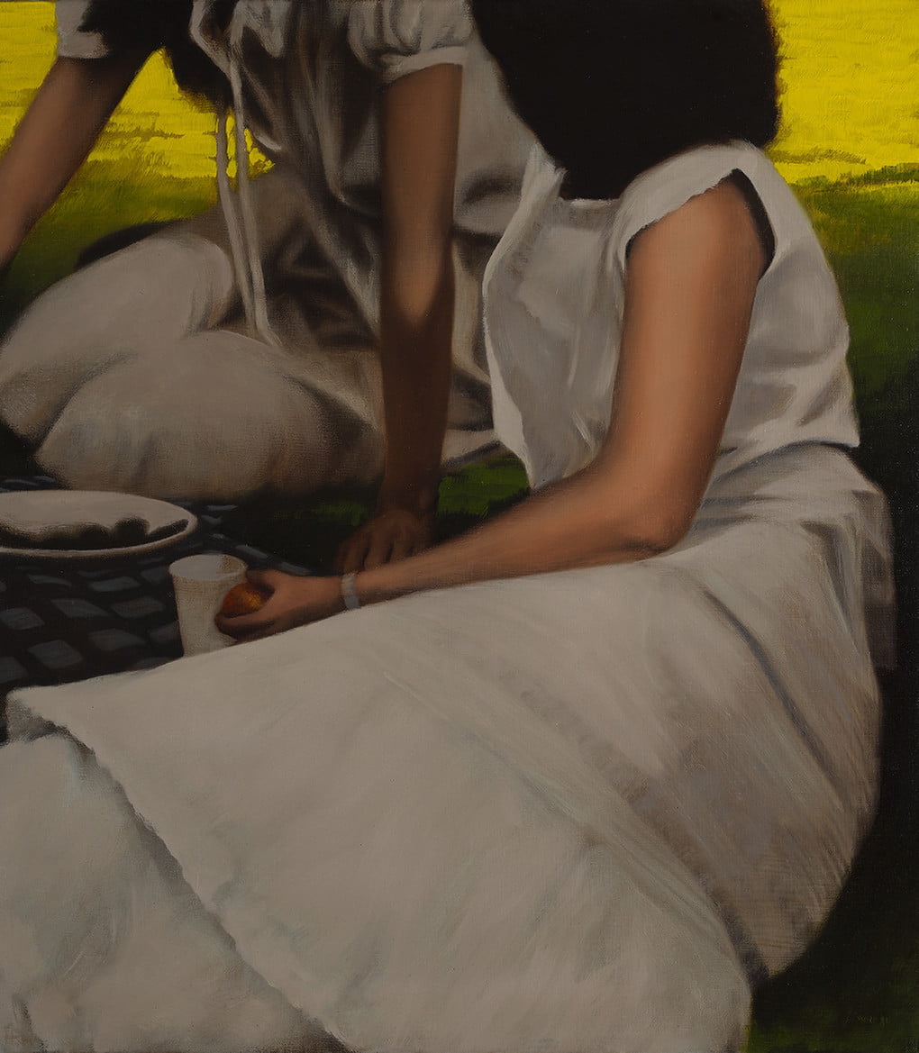 “Raffinati ed eleganti dipinti a pastelli raffiguranti gruppi di persone durante un pic-nic o mentre conversano in interni, in una combinazione magica avvincente e fortemente pregnante di realismo pittorico e fotografico, opera di un giovane artista italiano”.